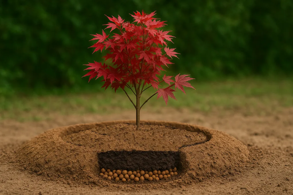 Per la messa a dimora deve essere utilizzato un terreno leggermente acido con un Ph 5,8-6,0. Occorre fare attenzione anche al ristagno idrico o alla presenza di strati impermeabili sul fondo della buca. Questa e’, infatti, una delle cause piu’ frequenti di deperimento della pianta. Per l’ impianto in fioriera si suggerisce di stendere sul fondo uno strato di alcuni centimetri di argilla per facilitarne il drenaggio. Nella terra degli “Aceri di Omate” si dice che questi, quando vengono piantati, devono sentire le campane… Non siamo impazziti, e’ semplicemente un modo di dire molto realistico per suggerire che, al momento dell’ impianto, il colletto della piante deve essere messo piuttosto sollevato rispetto al livello del terreno.